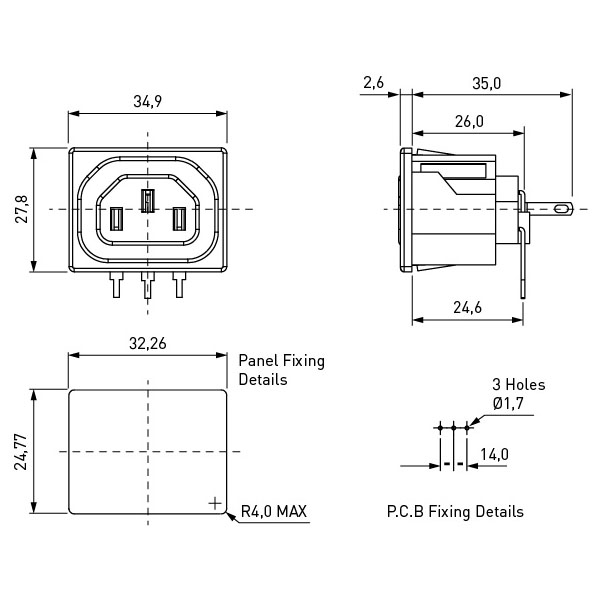 IEC Power outlet 2+E snap-in 2.0mm with PC spills for PCB mounting