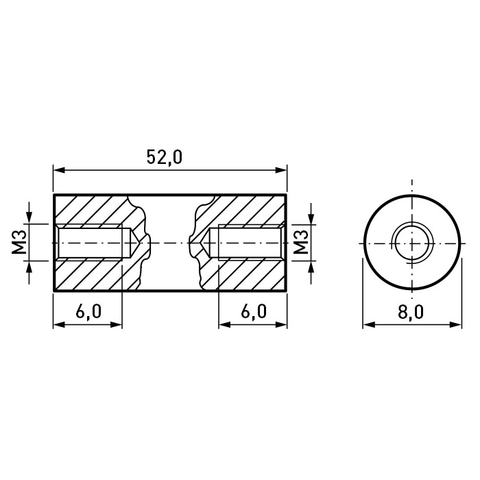 Insulated Standoff PA-Brass F/F ø8x52 | Thread M3x6 / M3x6