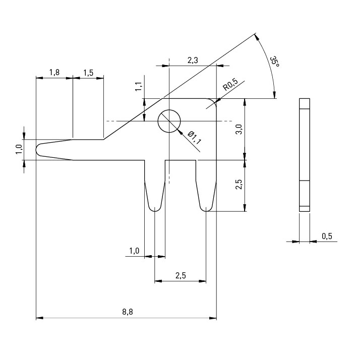 Solder Terminal Pin 1.0x8.8mm 90° Brass tinned 0.5mm thick