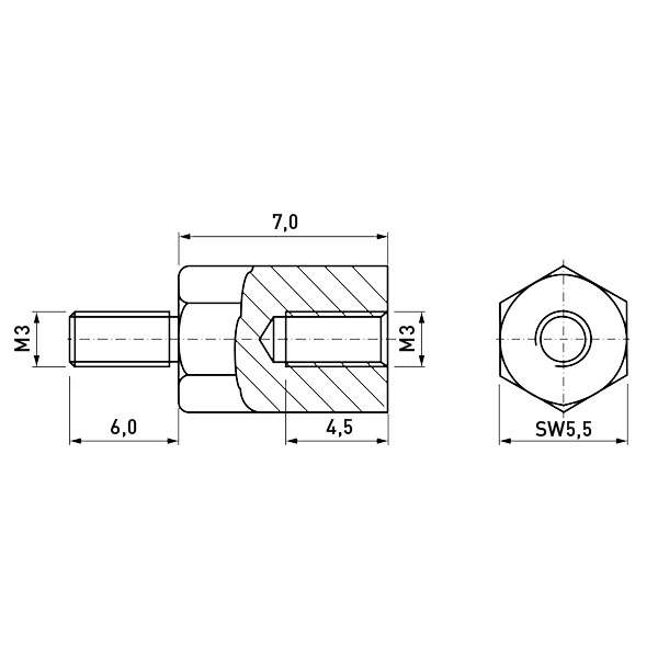 Standoff Galvanized Steel M/F AF5.5x7 F=M3x4.5 M=M3x6 w/ Undercut