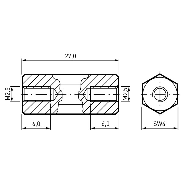 Abstandsbolzen Messing vernickelt I/I SW4x27 | Gewinde M2,5x6 / M2,5x6