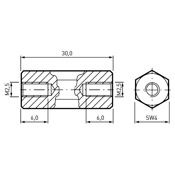 Abstandsbolzen Messing vernickelt I/I SW4x30 | Gewinde M2,5x6 / M2,5x6
