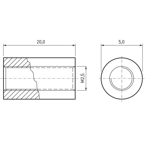 Abstandsbolzen PA6.0 GV25 schwarz I/I Ø5x20 | Gewinde M2,5 durchgehend