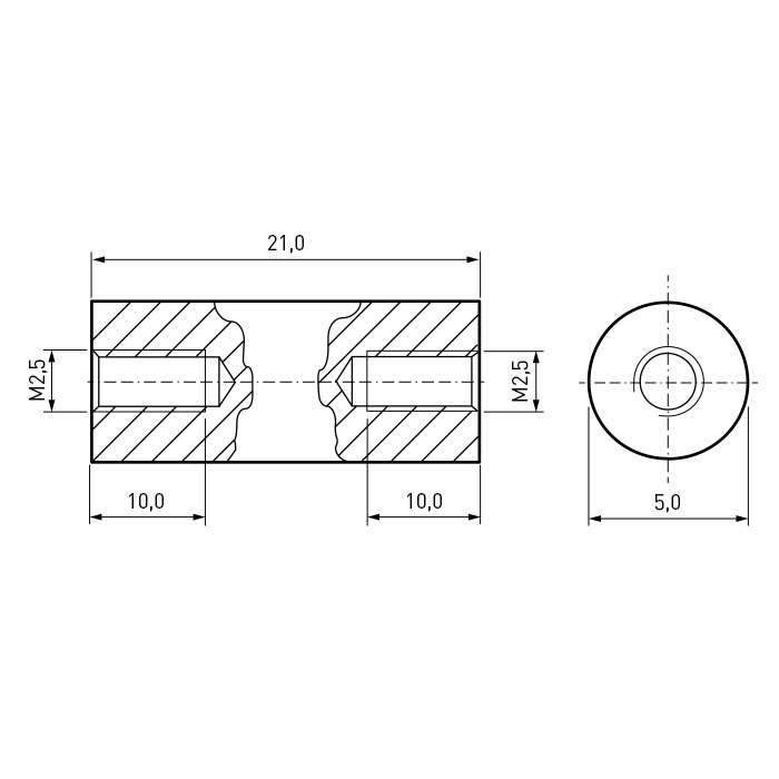 Abstandsbolzen PA6.0 GV25 schwarz I/I Ø5x21 | Gewinde M2,5x10 / M2,5x10