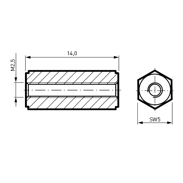 Abstandsbolzen PA6.0 schwarz I/I SW5x14 | Gewinde M2,5 durchgehend