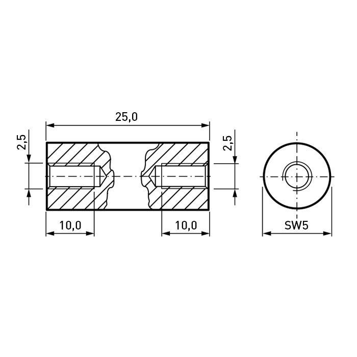 Abstandsbolzen PA6.0 schwarz I/I SW5x25 | Gewinde M2,5x10 / M2,5x10