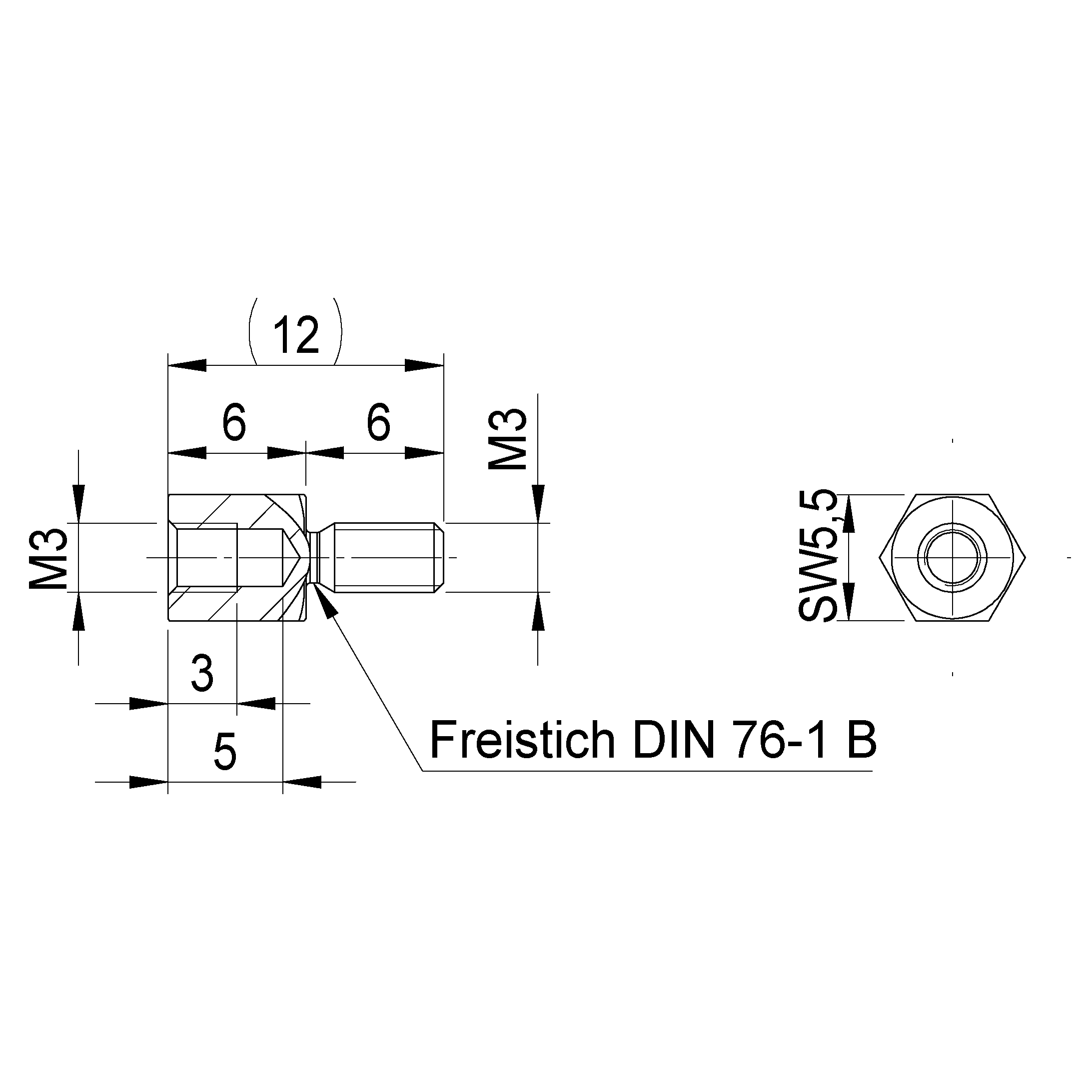 Abstandsbolzen Stahl rostfrei blank I/A SW5,5x6 I=M3x3 A=M3x6 m. Freistich