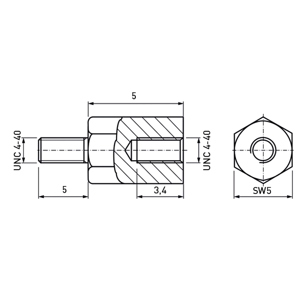 Abstandsbolzen Stahl rostfrei blank I/A SW5x5 I=UNC4-40x3,4 A=UNC4-40x5 o.F.