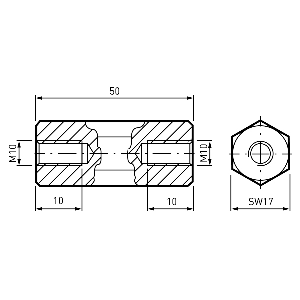 Abstandsbolzen Stahl rostfrei blank I/I SW17x50 | Gewinde M10x10 / M10x10