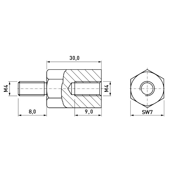 Abstandsbolzen Stahl verzinkt I/A SW7x30 I=M4x9 A=M4x8 m. Freistich
