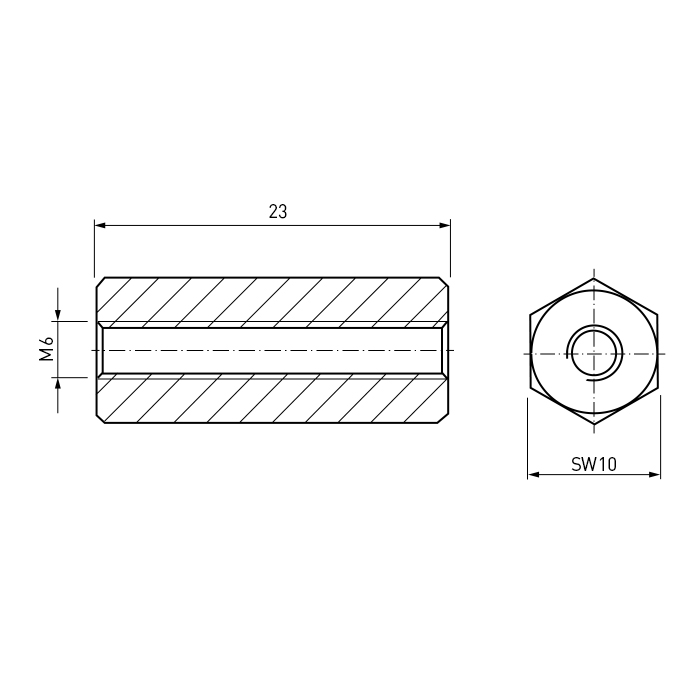Abstandsbolzen Stahl verzinkt I/I SW10x23 | Gewinde M6 durchgehend