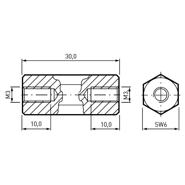 Abstandsbolzen Stahl verzinkt I/I SW6x30 | Gewinde M3x7 / M3x7