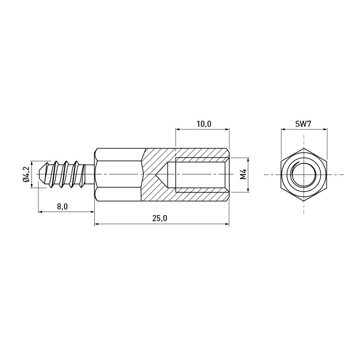 Abstandsbolzen Stahl verzinkt Schneidg. SW7x25 I=M4x10 A=ST4,2x8 m. Freistich