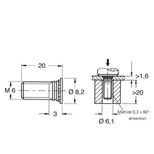 Einpressbolzen M6x20,0 Stahl rostfrei A2 passiviert
