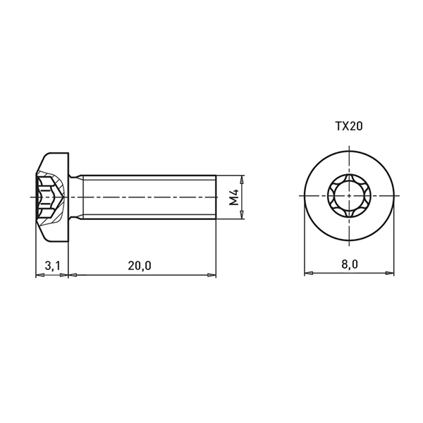 Flachkopfschraube ISO14583 M4x20 Stahl 8.8 verzinkt Torx Linsenkopf