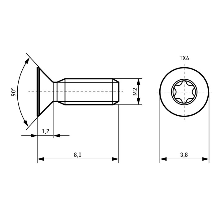 Senkkopfschraube ISO14581 M2x8 Stahl 4.8 verzinkt Torx