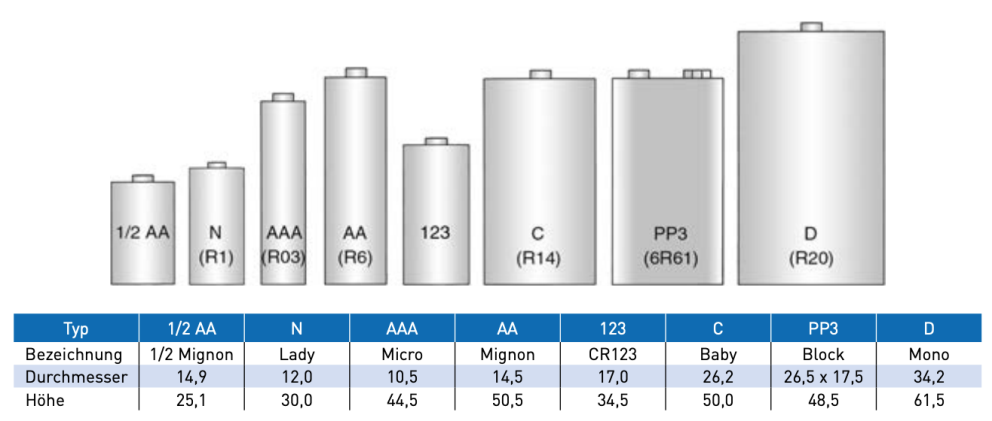 ETTINGER bietet seit Jahrzehnten hochwertige Batterietechnik namhafter Hersteller in unterschiedlichen Ausführungen und für eine große Bandbreite von Batterietypen. Zur besseren Orientierung stellen wir Ihnen nachfolgend die Batterie-Abmessungen vor, zu denen Sie bei uns online Batteriehalter erwerben können. Zusätzlich zu dieser Liste führt ETTINGER Knopfzellen, die in verschiedenen Abmessungen auch größtenteils ab Lager erhältlich sind. Batterien selbst befinden sich nicht in unserem Lieferprogramm.